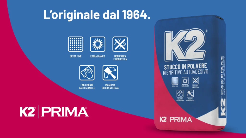 Oggi, presentiamo lo stucco K2 polvere con una nuova veste grafica: più attraente, distintiva e immediatamente riconoscibile grazie all’uso degli storici colori (il blu, il bianco ed il rosso).